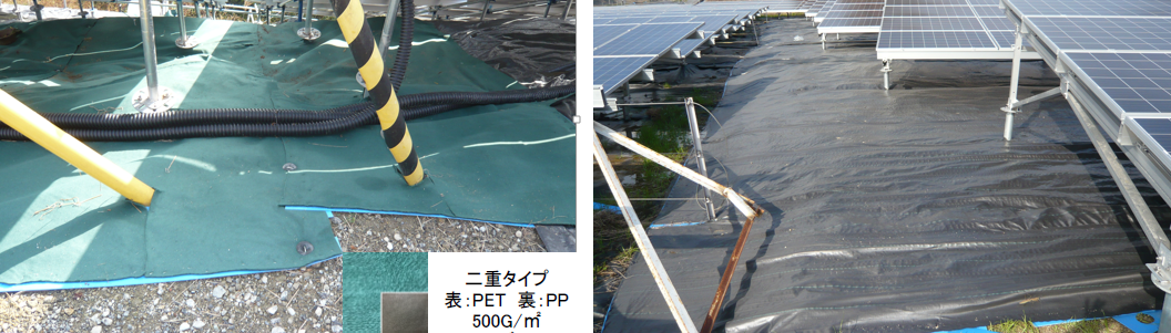 従来のシートと2重構造になっているシートと使い分けしました。従来の水が浸透するシートはその下の土を侵食するので平地は問題ないですが法面は心配です。