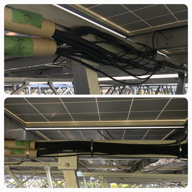 太陽光施設パネル下の配線は何本もまとまった箇所の結束バンドは素材や材質にもよりますが湿気や紫外線により想定したより早く結束バンドが切れて